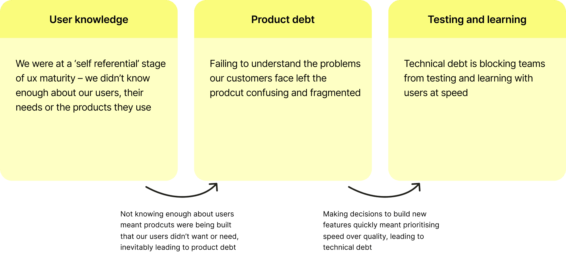 The lack of user insights contributed to product debt, with features built that didn’t solve real user problems. The focus on rapid feature development without alignment to user needs led to a fragmented product experience, requiring costly rework.Testing and learning: