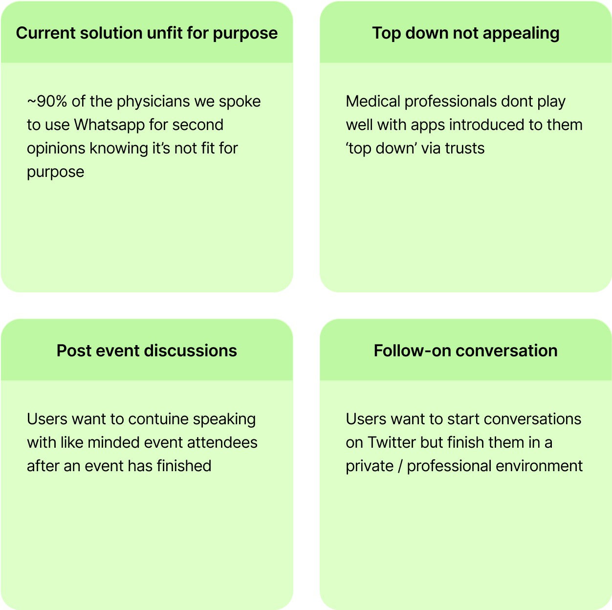 Further rounds of user testing allowed us to present and learn about various iterations of the product idea, narrowing and shifting our focus towards ‘groups and communities,’ particularly around second opinions and secure sharing of case or patient information. Uncovering key and industry leading findings giving us visibility to gaps and user needs underserved or not currently solved commercially.