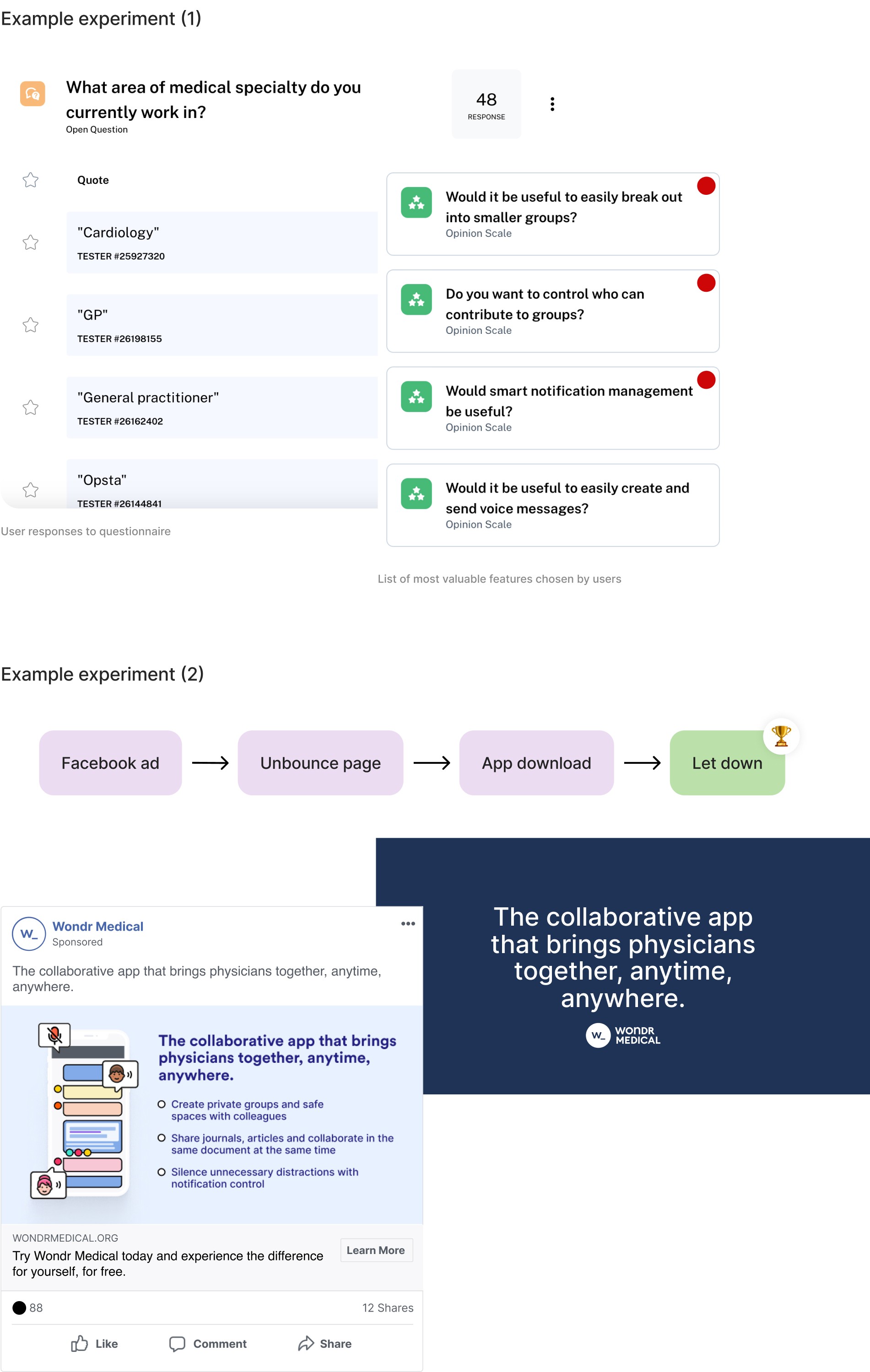 Our fake door test (Experiment 2) gave us a true insight as to whether doctors expressed interesed in our proposed app idea. Using Facebook ads we were able to target physicians with our (at the time fake) Wondr Medical app. Users were directed to a marketing page promoting the app, where they could initiate a download to their preferred native platform; Android or iOS. This experiment allowed us to gauge the appetite for our app solution in the real world, away from labs, video calls and testing environments. The app was downloaded 150 times in 5 days.